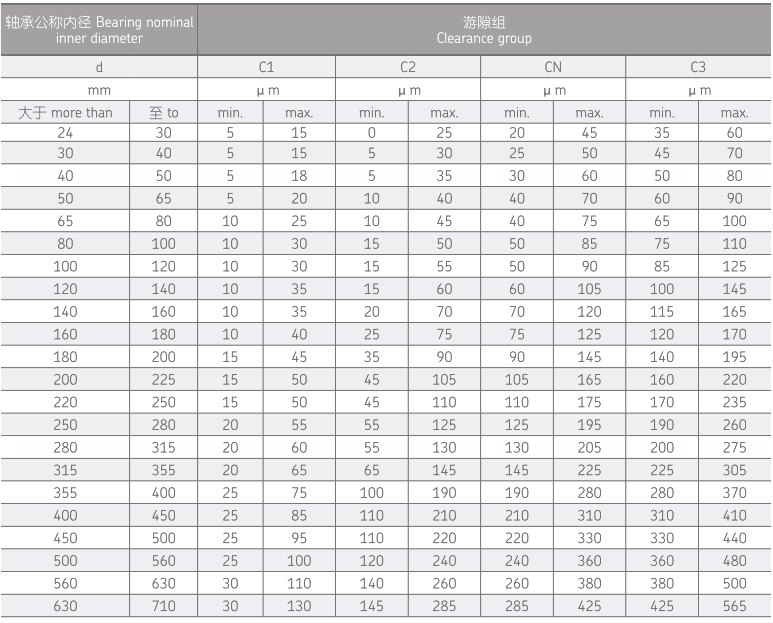 表中数值适用于圆锥孔或圆柱孔的单列和双列圆柱滚子轴承游隙组别符合 DIN 620-4。