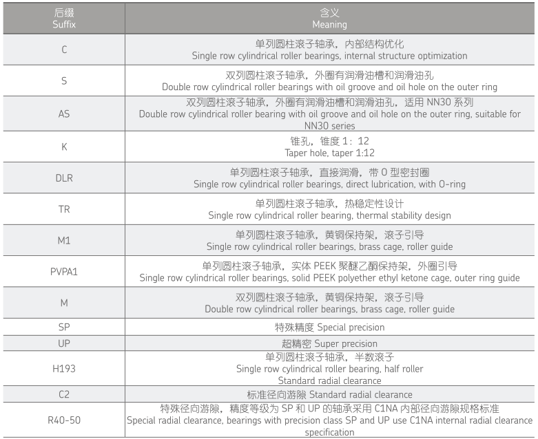 游隙组别 C2、CN 和 C3 可以用作后缀订购精度为 SP 和UP 的轴承,轴承套圈可互换。